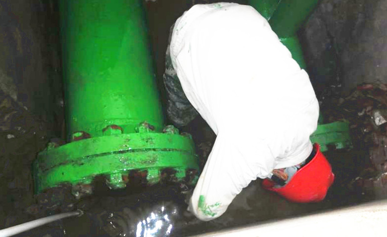 原鹵管線是采鹵崗位重要的組成部分,是停車必檢項之一。但是檢修難度不小,一是過道空間狹小,光線昏暗,一次僅夠兩個人同時作業(yè);二是檢修原鹵管線時,必須“涉水”作業(yè)。檢修期間原鹵管線一閃一閃的焊光將周圍照亮,順著火花向里看去,只見有兩個人在狹小的空間綣著身子低頭忙活著,感覺身子都轉(zhuǎn)不開的樣子。他們像小貓似的蜷縮在兩邊,全身濕透,白色的工服也被銹漬染的亂起八糟,被油漬沁透成一坨一坨的,但他們堅定的眼神、專注的神情卻叫人佩服。我不禁問道:“這么窄的空間人咋進(jìn)去啊?”他們開玩笑的說:“用縮骨功!”