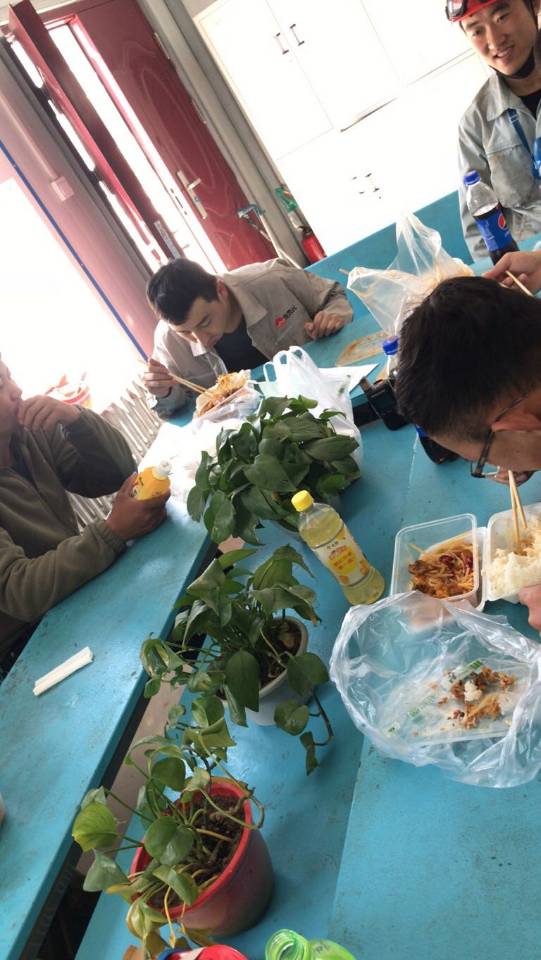 中午時(shí)分,辛苦的工作人員狼吞虎咽般的吃著熱乎乎的飯菜