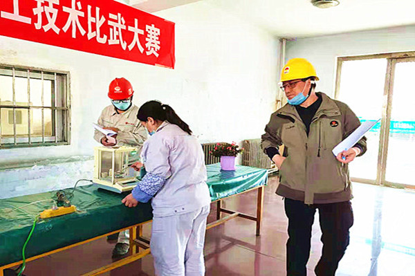 比賽現(xiàn)場女職工熟練的操作技能,沉著冷靜,對電石破碎樣品進(jìn)行計量稱重;對工作一絲不茍,嚴(yán)格把控電石發(fā)氣量。