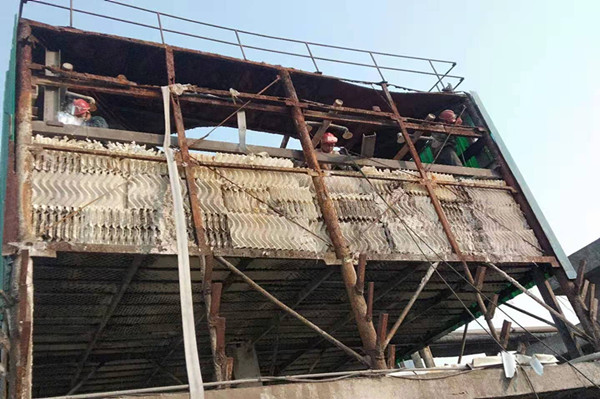 在完成相關作業(yè)的準備工作,穿戴好各類防護用品,簽發(fā)了各類票證后,大家就進入到檢修現(xiàn)場。加固冷卻塔前,必須先拆除冷卻塔壁板,清洗冷卻塔填料雜物及易燃易爆物質。由于冷卻塔結構腐蝕嚴重,填料內(nèi)部含易燃易爆物質多,所以必須對冷卻塔進行多次沖洗徹底除去易燃易爆物質才能進行動火加固作業(yè)。