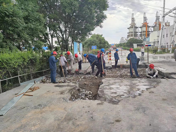 廠區(qū)道路修繕工作存在邊修復(fù),邊疏通車輛同行,時(shí)間緊、任務(wù)重等諸多困難,但公司干部職工發(fā)揚(yáng)不怕苦、不怕累的精神,上下齊心、同心協(xié)作,有信心安全、保質(zhì)、按計(jì)劃完成修補(bǔ)工作。