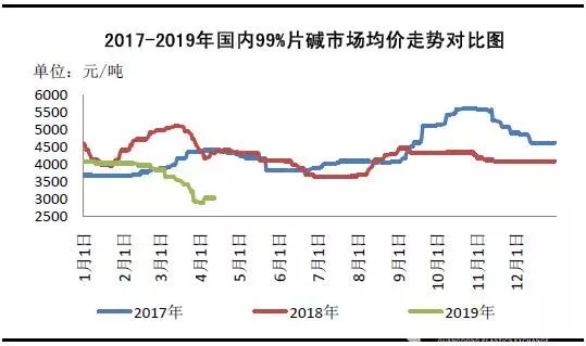 圖1 2017-2019年國內(nèi)99%片堿市場(chǎng)均價(jià)走勢(shì)對(duì)比