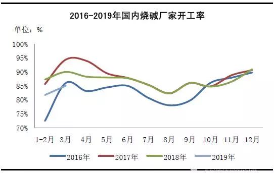 圖2 2016-2019年國內(nèi)燒堿廠家開工率