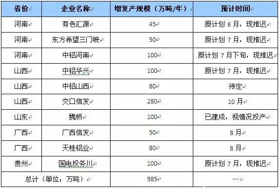 表1 2019年國(guó)內(nèi)氧化鋁增復(fù)產(chǎn)統(tǒng)計(jì)(數(shù)據(jù)來(lái)源:東證期貨)