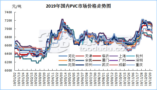 2019年中國國內(nèi)PVC市場仍舊是價格高位整理的一年,全年價格波動區(qū)間以華東主流為例在6440-7225元/噸之間,高低價差785元,從走勢圖以及月均價走勢可以看出,2019全年經(jīng)歷兩撥較大幅度的推漲,其中第一季度1-3月份市場較為低迷,處于低谷整理期,4月份開始市場價格開始緩慢上漲,經(jīng)歷不斷的上漲價格在5月中旬開始達(dá)到年內(nèi)第一次高點(diǎn),價格達(dá)到高點(diǎn)后,需方承受能力有限,價格開始下行,下行至6月中下旬后,市場開始進(jìn)入緩慢的整理期,長達(dá)4個月,6月中下旬-10月中旬,價格一直處于小幅震蕩整理中,供需雙方的博弈一度令PVC整體產(chǎn)業(yè)鏈進(jìn)入迷茫期,多數(shù)行業(yè)內(nèi)人士甚至認(rèn)為PVC產(chǎn)品的下跌大周期開始來臨,我們回顧下往年的PVC行情,其價格在15年5月初達(dá)到最低點(diǎn)后內(nèi)蒙出廠4350元/噸含稅,價格在歷史低點(diǎn)后開始不斷反彈,在經(jīng)歷了16-18年的整理后,在19年中國國內(nèi)PVC市場仍占據(jù)高點(diǎn),四年間PVC生產(chǎn)企業(yè)賺的盆滿缽滿。但下游制品企業(yè)卻苦不堪言,并且自18年國家稅控改革以來,次終端貿(mào)易商對稅票逐漸失去控制,導(dǎo)致次終端利潤不斷下滑,規(guī)范的市場導(dǎo)致票貨分離減少。而在整個PVC產(chǎn)業(yè)鏈中,生產(chǎn)企業(yè)占據(jù)越來越多的話語權(quán),從而導(dǎo)致了雖然我們看到在迷茫期過后,第四季度國內(nèi)PVC市場仍舊迎來年底第二次大漲,此次上漲把PVC價格推上了真正的年底高點(diǎn)。第四季度的上漲導(dǎo)火線為內(nèi)蒙企業(yè)裝置出現(xiàn)意外事件停產(chǎn),市場炒作聲漸起,價格開始上漲,而隨后的11-12月份,在期貨的帶動下,價格不斷被推上新高。12月中旬需方面對如此高的價格開始產(chǎn)生抵觸心理。而此時的年度備貨來臨,市場不但沒有復(fù)漲反而開始進(jìn)入蕭條期,價格開始下滑。
