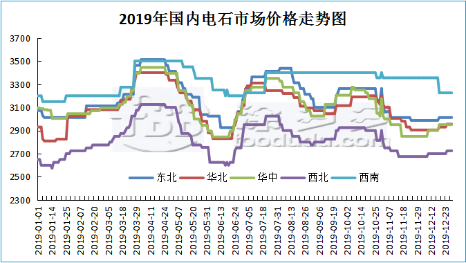 2019年中國國內(nèi)電石走勢上半年跟隨PVC走勢類似,第一季度震蕩上行整理,4月份到達(dá)年度高點(diǎn),但隨后價格開始下行,下行至6月中旬又開始震蕩上漲,隨后的三四季度震蕩走低中。整體來看作為PVC上游原料,電石的走勢類似于PVC走勢,但并不完全相同,尤其下半年,我們可以推測,下面的PVC收到資金以及市場炒作以及期貨方面的影響較大,并不是從供需、原料方面受到影響。