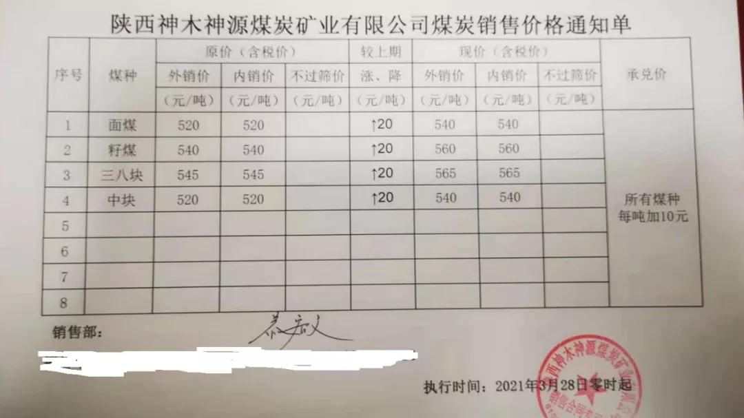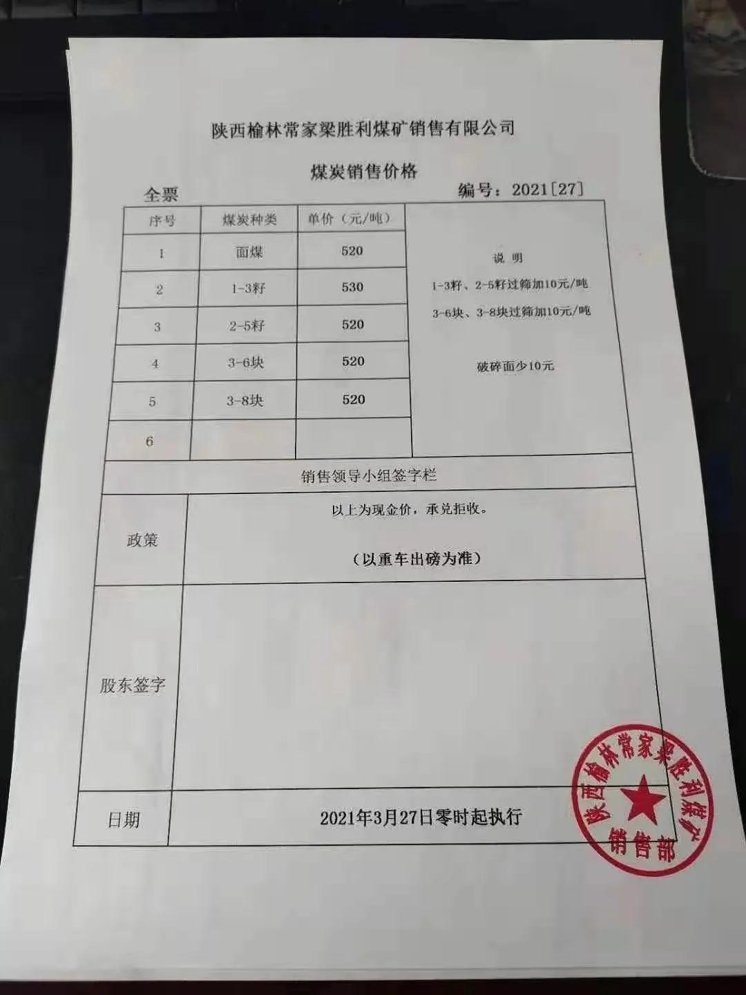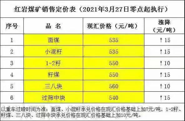 府谷縣老高川鄉(xiāng)恒益煤礦3月27日上午10:00:00時起,面煤、次精煤、二五籽、四九塊各漲價10元/噸。